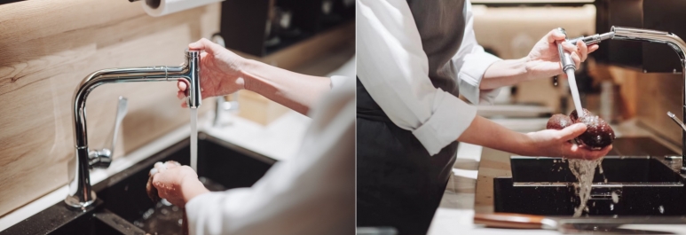 与石英石水槽相得益彰的雅生奇特里奥厨房龙头,可抽拉取水,搭载Select按键龙头,满足自如切换双开关水功能。让用水成为艺术,石槽与龙头相互搭配成为晚宴操作区的点睛之笔。