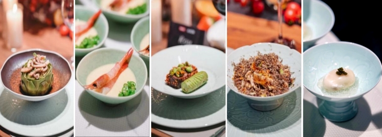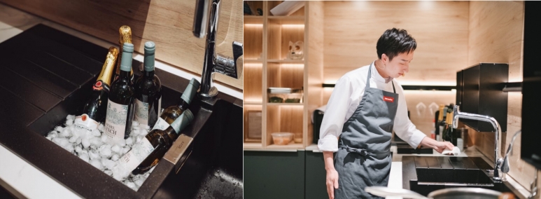 在双方品牌代表的欢迎辞后,晚宴正式开始。明星主厨李开贵William为在座嘉宾现场介绍私享定制菜品。油卤野蓟八爪鱼、椒香芙蓉虾,开胃前菜和汤品为这场冬聚带来阵阵暖意。雅生奇特里奥龙头可抽拉的设计,轻松清洗棘手的海鲜;水槽的案板功能设计,让操作丝滑方便的同时也保持烹饪过程的洁净。烹饪海鲜需要严格把控时间和温度,美诺蒸烤一体机轻松掌握,精准控温还原食材本味。