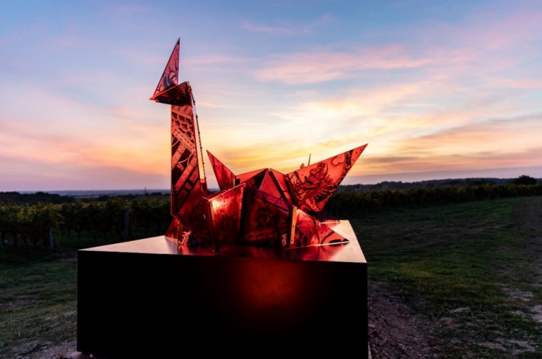 这款产品的灵感源于著名艺术家格温德琳·菲纳·德维莱纳(Gwendoline Finaz de Villaine)创作的“龙之旅”雕塑。这件折纸龙作品也有纪念中法建交60周年的重要意义。该作品于2023年6月在位于巴黎市中心塞纳河左岸的先贤祠广场首次亮相展出,然后开启全球之旅。它在10月到达法国干邑地区,坐落于卡慕家族葡萄园的高处,面朝东方,以此纪念两国关系。2024年6月,它还将“飞”抵中国长城,在中国龙年装点中华大地。