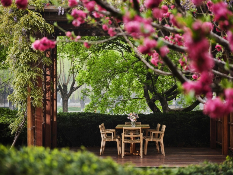 北京宝格丽酒店花园露台由瑞士知名园林景观建筑大师Enzo Enea精心设计,坐拥亮马河畔迷人景致,巧妙融合了古典高贵意式风格与当代景观美学,沿着河畔向酒店漫步,宾客的感官随之起伏。木兰、竹子、丁香、松树、紫藤、与粉红桃花等本土植物的巧妙运用,不仅为花园露台增添了浓厚的诗情画意,更赋予空间独特的艺术气息,共同营造出宝格丽意式生活美学。宾客可于春日暖阳下,享受花园露台宁静的时光,亦可品味时令更替带来的多重美食馈赠。