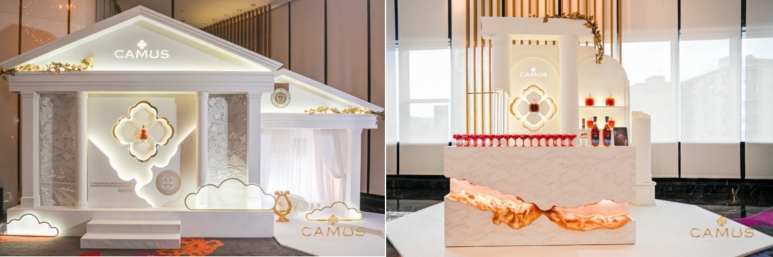 舞会现场特别呈现两大展示区域,展示卡慕CUVEE 4.186及多款干邑:以古罗马神殿为灵感,将酒瓶放置于“神殿”上的卡慕金花中,宛如古代神殿中的稀世珍宝。