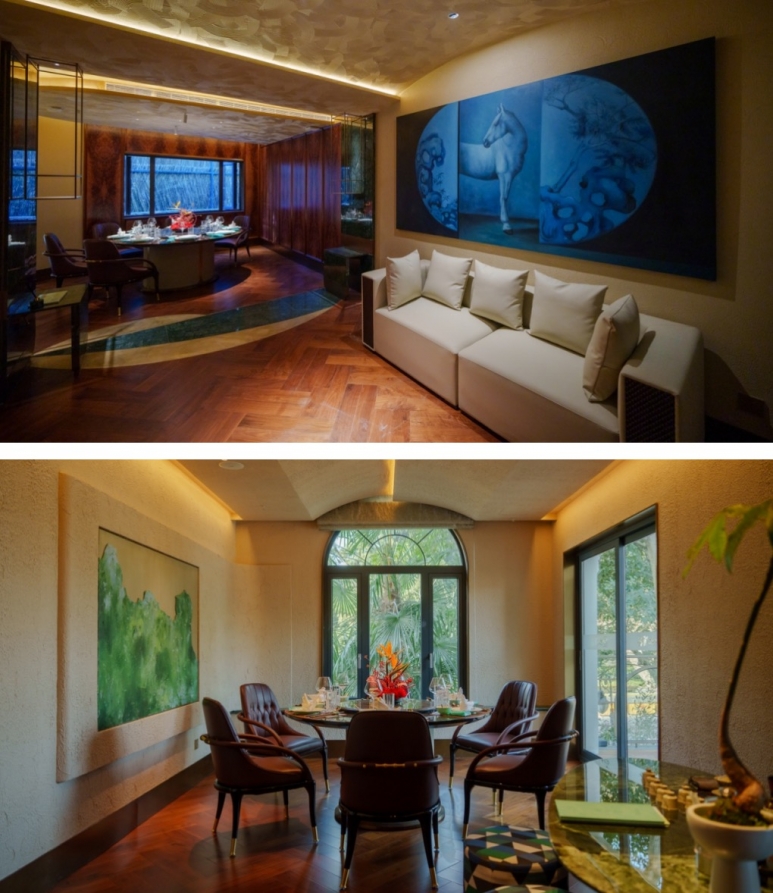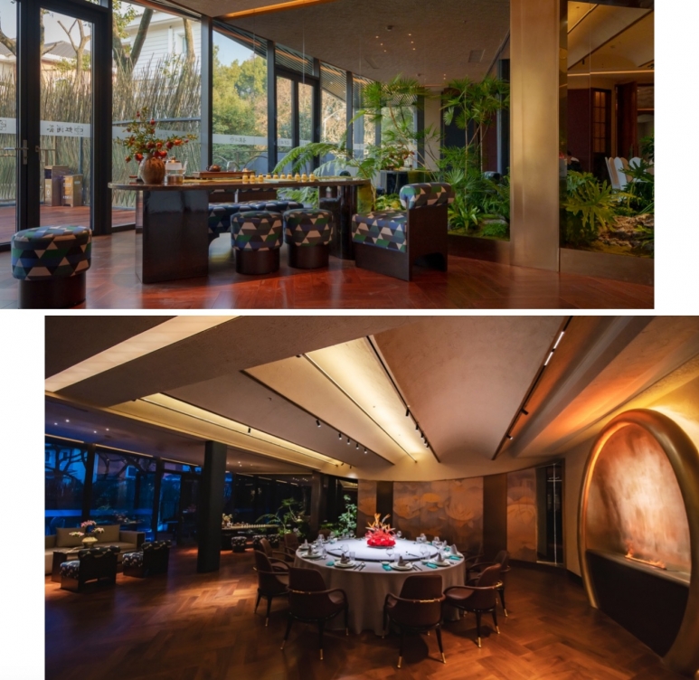 餐厅为新当代中式空间,空间洁净、宁谧,一共13间包房,每个包间设有独立的休憩区,设计简单雅致,大面积艺术造景,让每个角落都透着中式风格。有的包房则是直通景观庭院,可观秀丽风景,为现代紧张的都市生活提供一方心灵休憩之所。
