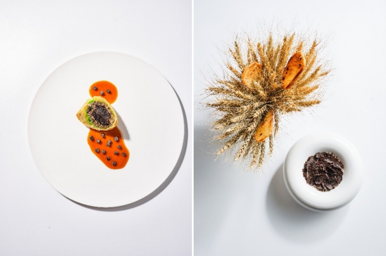 布里芝士不仅是法国经典的奶酪之一,在全世界也备受喜爱。主厨威廉通过重构布里芝士的奶油质地,将其柔软香浓的泡沫与具有独特浓郁香味的黑松露搭配,使布里芝士绵密醇厚的丰富口感焕发全新活力。盘侧摆放在麦穗束之中的自制切片面包,是主厨威廉的精巧设计,赋予了菜品自然生机的气息,打造独特用餐体验。