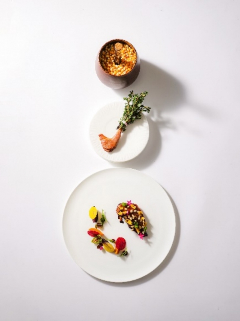 精心挑选来自江苏淮南农场,每只重量在500至600克之间的鸽子,取其肉质最为饱满的鸽腿和鸽胸肉进行烹制。经48小时干式熟成后,主厨以法式传统的油封方式烹饪鸽子腿,低温慢煮的方式烹饪鸽胸肉,将汁水完美的锁进肉质之中,而后加以烤制,一菜两吃,丰富味蕾,口感丰盈弹嫩。最后巧思搭配48小时熬制的自制酱汁、脆米和玉米片,以及点缀其中的甜菜薄片和蔬菜泥,脆嫩相宜,营养丰富。多样的食材质感的表达方式和蔬香与醇香的肉质相得益彰的融合,诠释了传统肉类菜品的多重可能性,为宾客呈现来自大自然的味蕾惊喜。