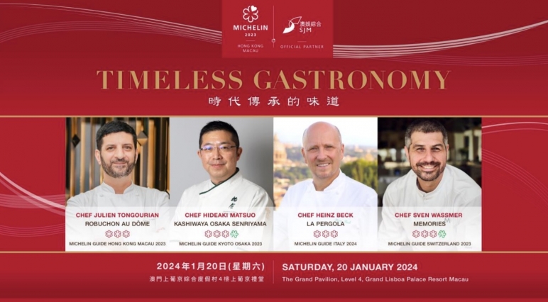 《香港澳门米其林指南》伙拍澳娱综合度假股份有限公司 (澳娱综合),呈献「Timeless Gastronomy」(时代传承的味道)星级飨宴。晚宴将于2024年1月20日在澳门上葡京综合度假村内瑰丽典雅的上葡京礼堂举行,届时将汇聚四位享誉国际的米其林星级餐厅名厨,联手打造充满惊喜的非凡飨宴。